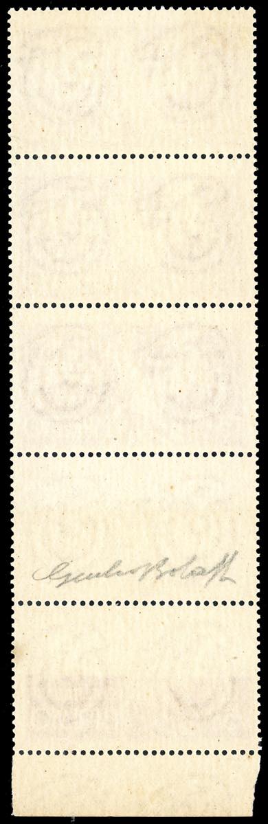 1947 - 15 lire Democratica, striscia verticale di 5, un esemplare con stampa totalmente mancante, uno con stampa incompleta (27bb), bordo di foglio, gomma originale integra, perfetta. Rara e d'effetto. Giulio Bolaffi per esteso.