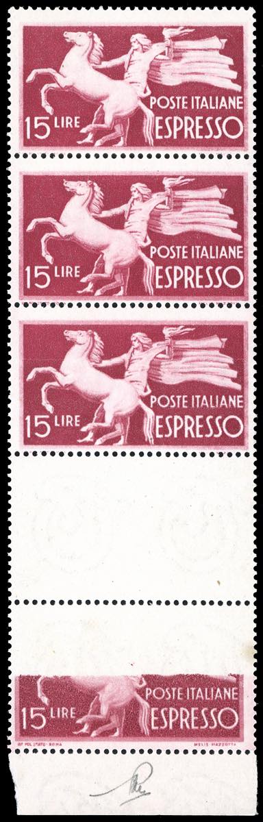 1947 - 15 lire Democratica, striscia verticale di 5, un esemplare con stampa totalmente mancante, uno con stampa incompleta (27bb), bordo ... Read more