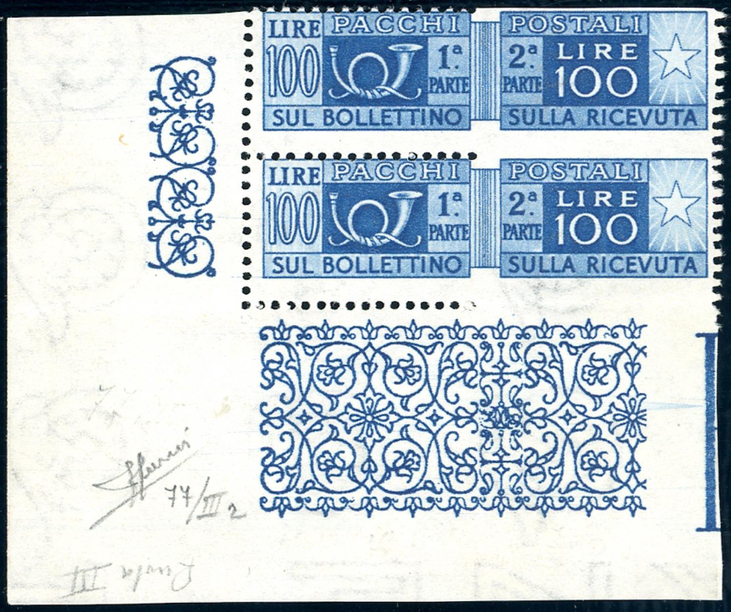 1946 - 100 lire, filigrana ruota III tipo, non dentellato al centro e nei lati orizzontali della sezione di destra (77/IIIr), coppia orizzontale, angolo di foglio, gomma originale integra, perfetta. Non comune. Sorani.