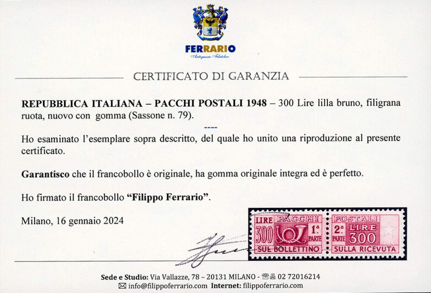 1948 - 300 lire, filigrana ruota (79), gomma originale integra, perfetto. Cert. Ferrario.