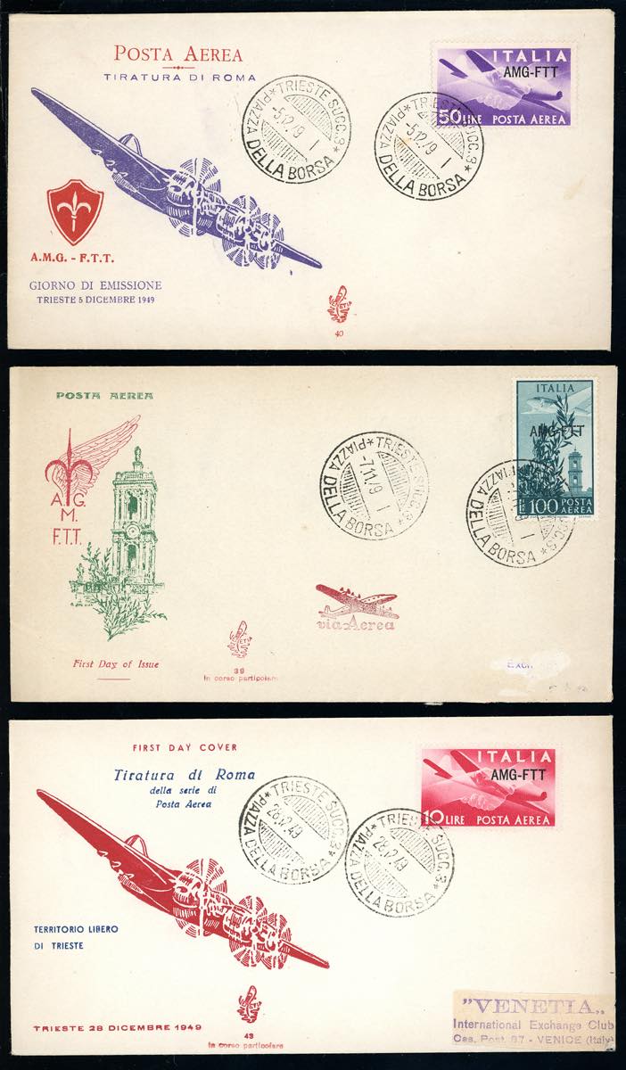 POSTA AEREA 1949/52 - Soprastampati su una riga, serie completa, il 1.000 lire Campidoglio dent. 14 x 14 1/4 (A20/A25,A26a), perfetti, su sei buste FDC Venetia, tra cui due raccomandate. Ferrario per il 26a.