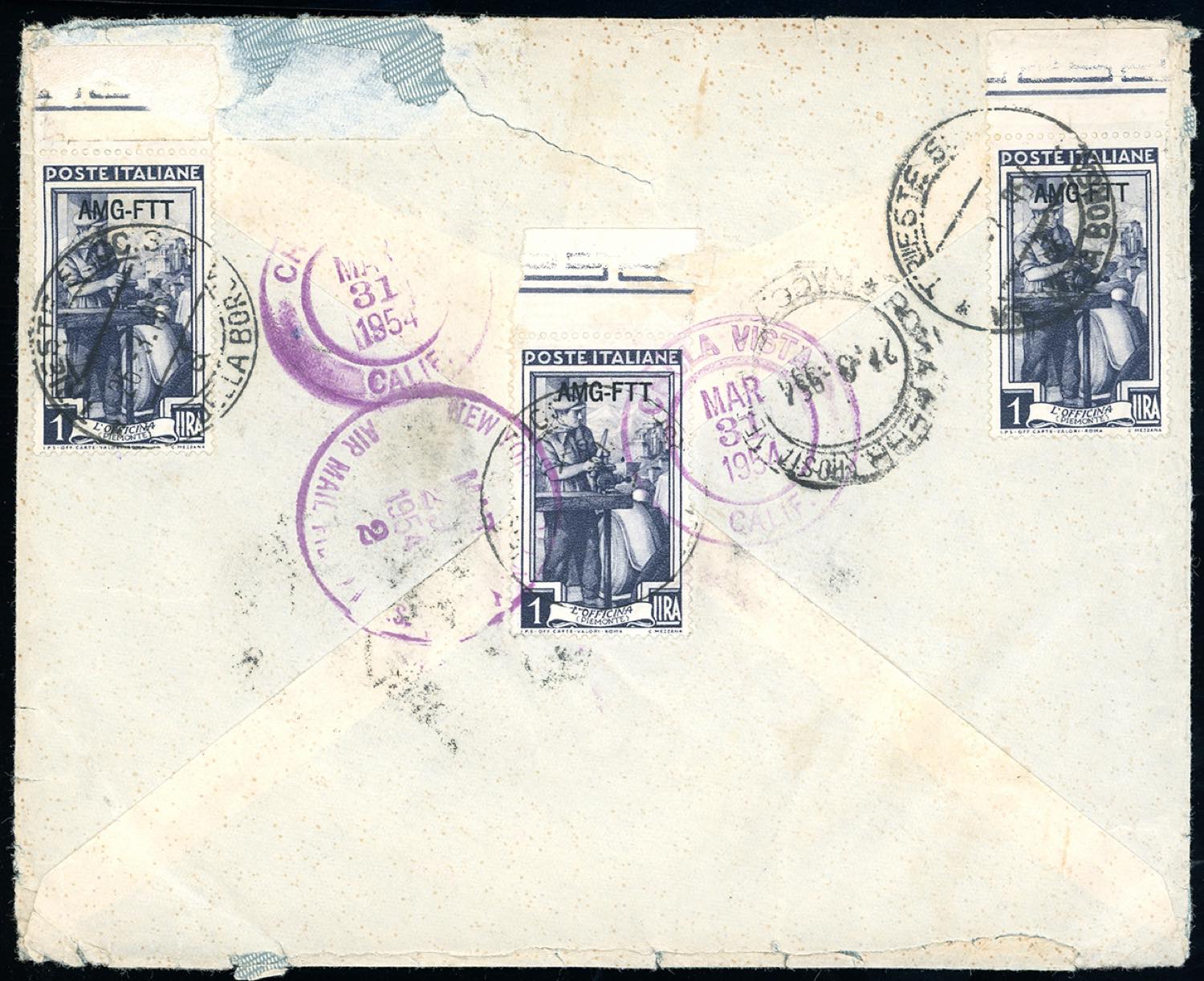 POSTA AEREA 1954 - 300 e 1.000 lire Campidoglio, 1 lira Lavoro, quattro esemplari di cui tre al verso (A24,A26,90), perfetti, su aerogramma raccomandato da Trieste 26/3/1954 per gli Stati Uniti. Non comune. Ferrario.