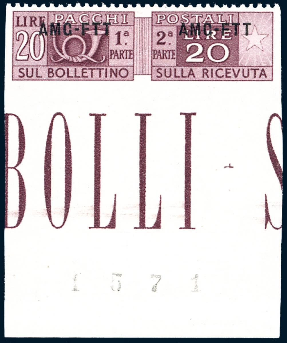 PACCHI POSTALI 1949 - 20 lire, soprastampa su una riga, dentellato solo in alto (19n), bordo di foglio, gomma originale integra, perfetto. ... Read more