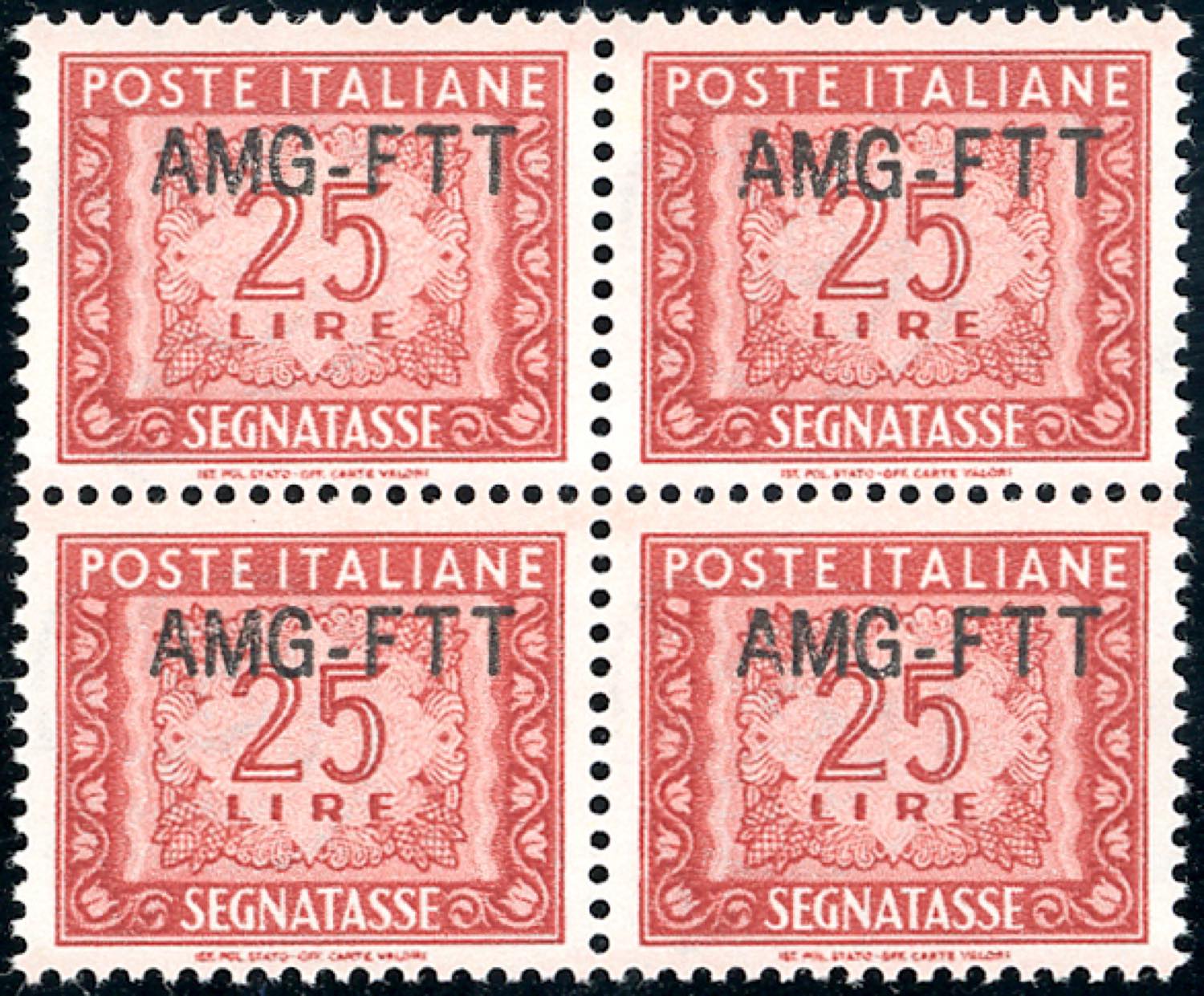 SEGNATASSE 1954 - 25 lire, nuovo tipo di soprastampa (25A), blocco di quattro, ottima centratura, gomma originale integra, perfetto. Bello! ... Read more