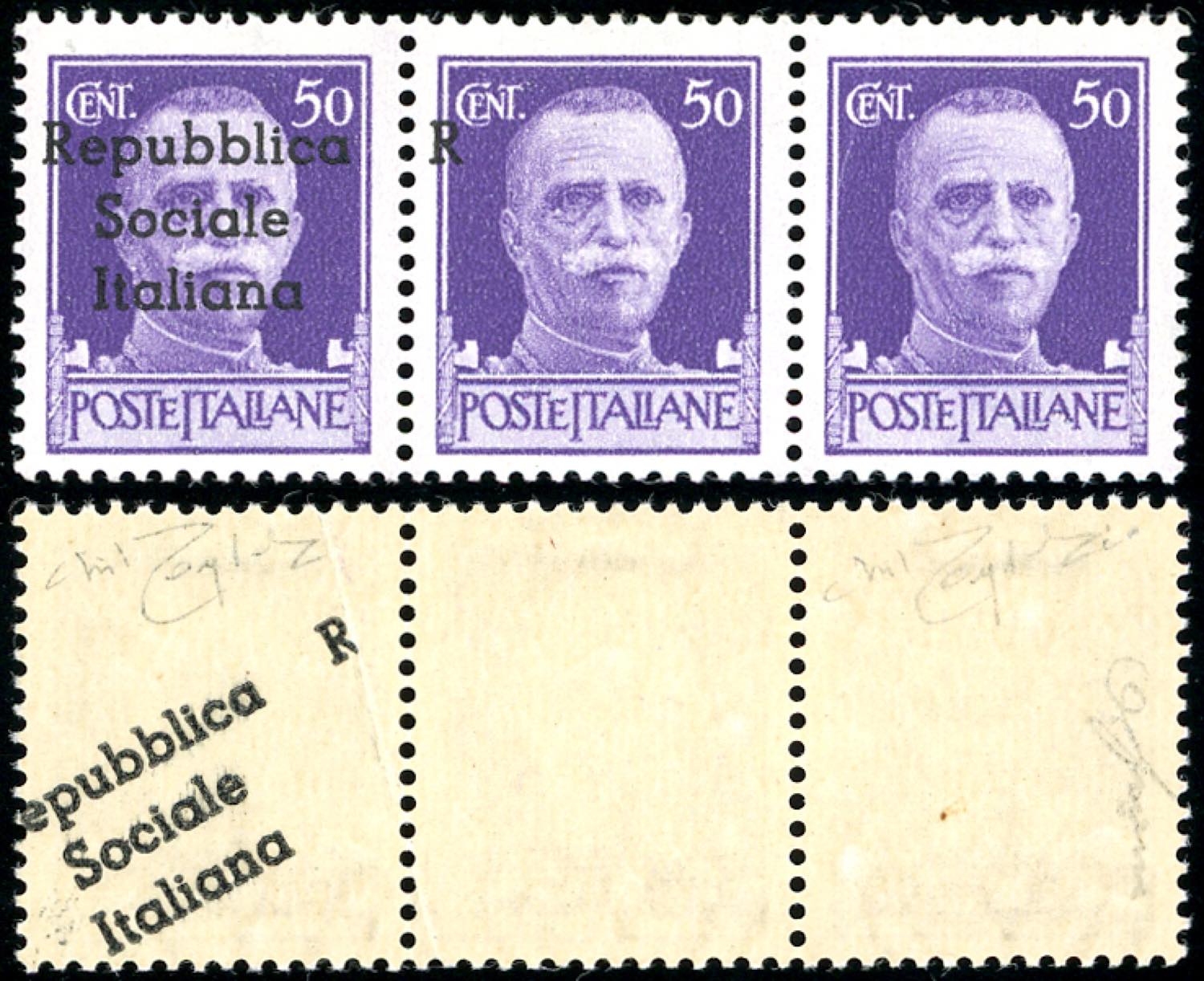 TERAMO 1944 - 50 cent. striscia orizzontale di tre di cui uno senza soprastampa, uno con soprastampa parziale (solo R) e uno con soprastampa completa (6ca), nuova, gomma originale integra, perfetta. Splendida ed UNICA NOTA. Raybaudi, cert. Ferrario.