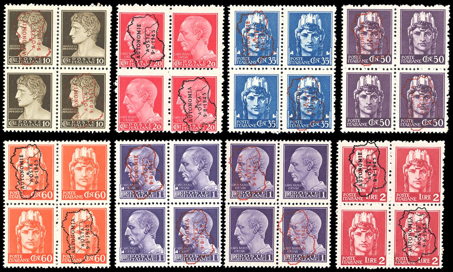 AOSTA EMISSIONE AUTONOMA DI PROPAGANDA 1945 - Serie complete in blocchi di quattro, francobolli di Luogotenenza soprastampati in italiano e ... Read more