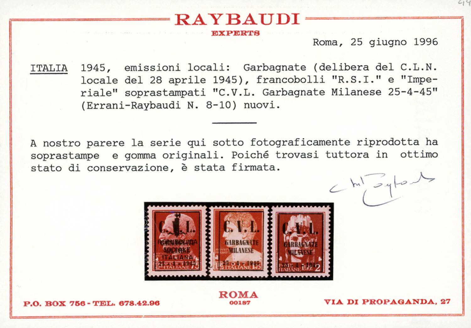 GARBAGNATE MILANESE 1945 - 75 cent. soprastampato R.S.I., non emesso, 1,75 lire e 2 lire Imperiale soprastampati (Errani Raybaudi ... Read more