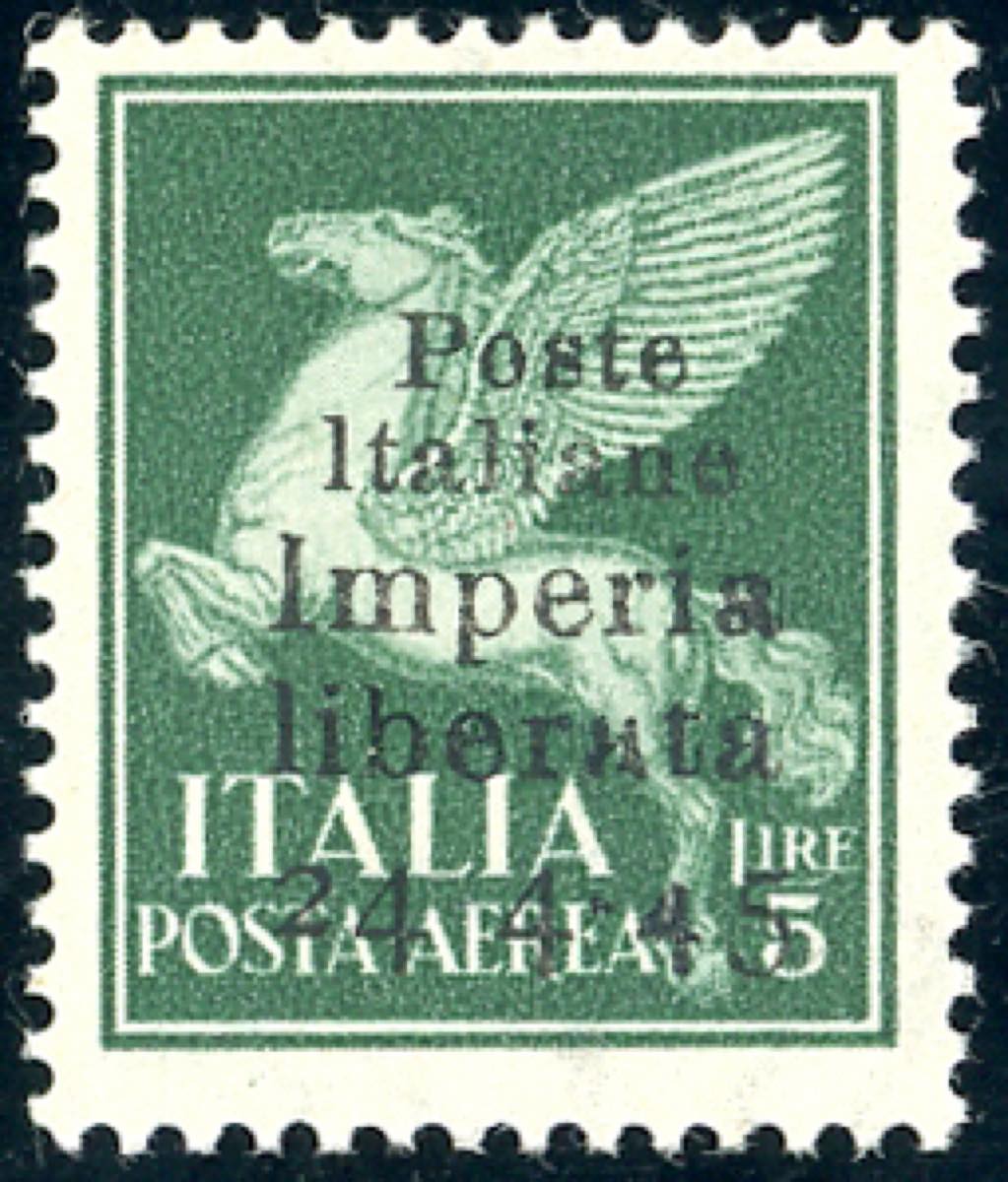 IMPERIA 1945 - 5 lire posta aerea, senza trattino tra "24" e "4" (17b), gomma integra, perfetto. Cert. Ferrario.
