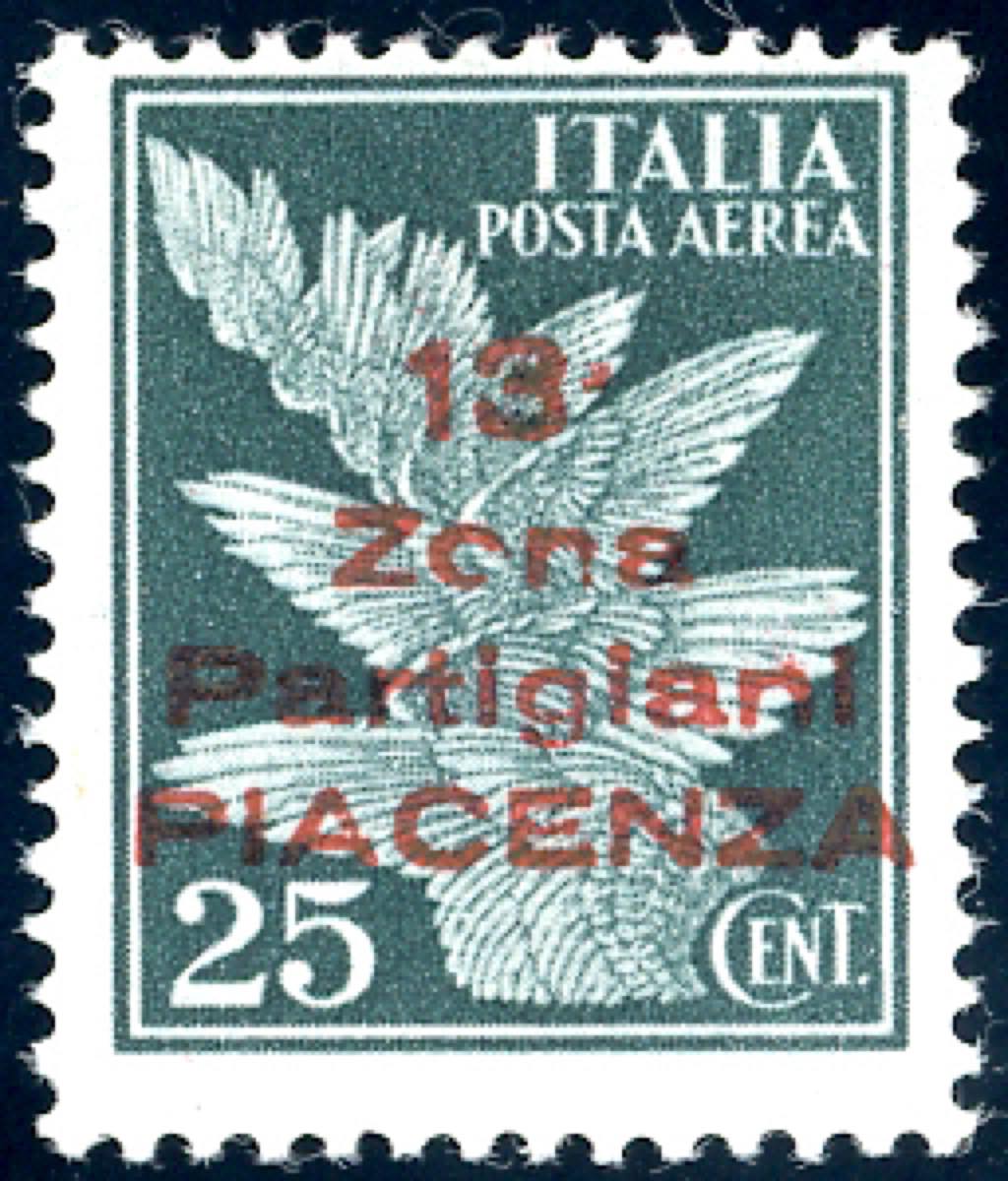 PIACENZA POSTA AEREA 1945 - 25 cent. verde scuro, SOPRASTAMPA ROSSA "13a Zona Partigiani Piacenza", anziché azzurra (Errani Raybaudi 15A), ... Read more