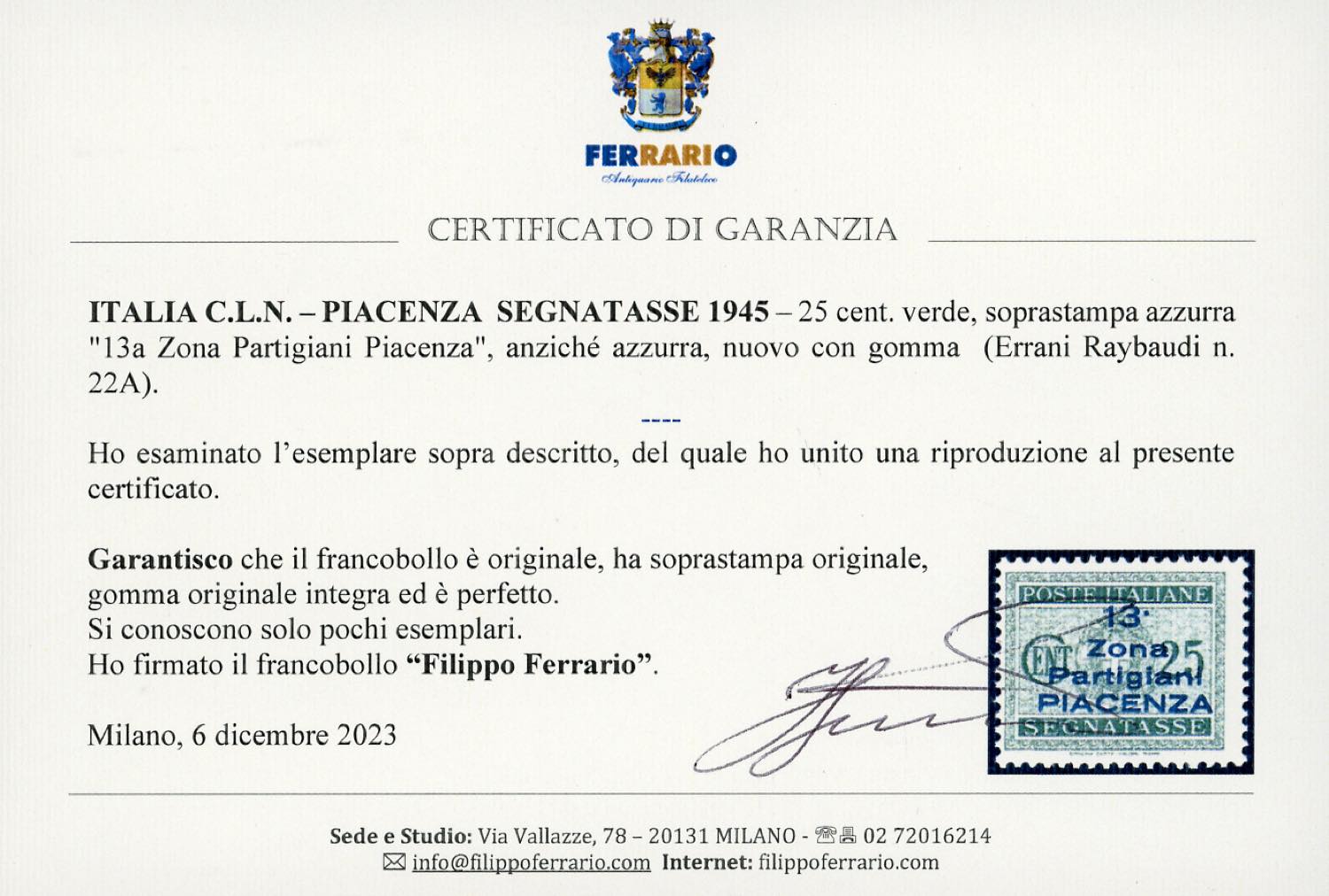 PIACENZA SEGNATASSE 1945 - 25 cent. verde, SOPRASTAMPA AZZURRA anziché rossa, "13a Zona Partigiani Piacenza" (Errani Raybaudi 22A), nuovo, ... Read more