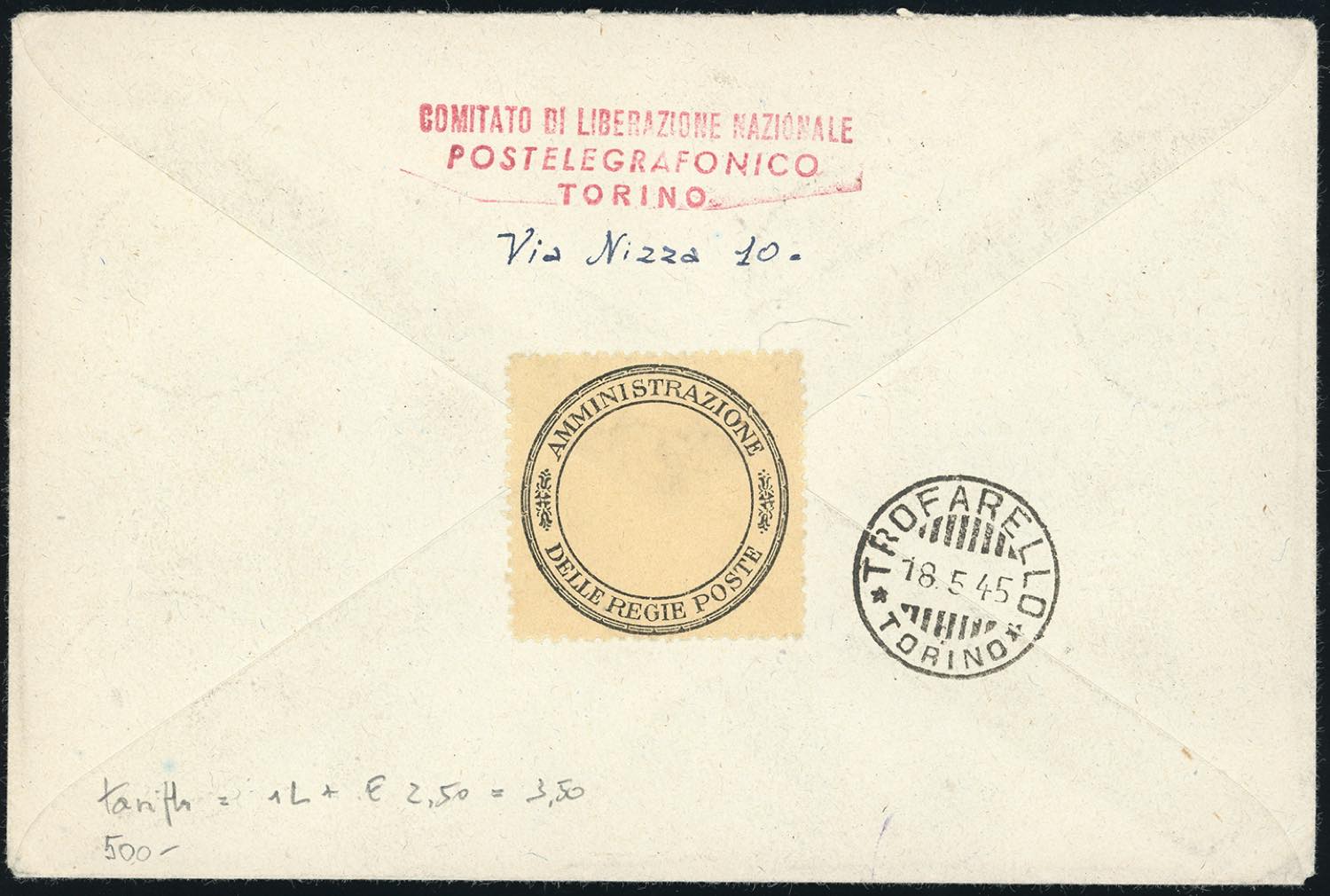 TORINO 1945 - 10 cent., 30 cent. con filigrana, striscia di tre, 50 cent. Monumenti Distrutti soprastampati, 1 lira Fratelli Bandiera soprastampato, coppia (Errani - Raybaudi 2,7,9,15), perfetti, su busta per espresso da Torino 16/5/1945 a Trofarello, bollo di arrivo. Rarità dell'emissione. Cert. Raybaudi.