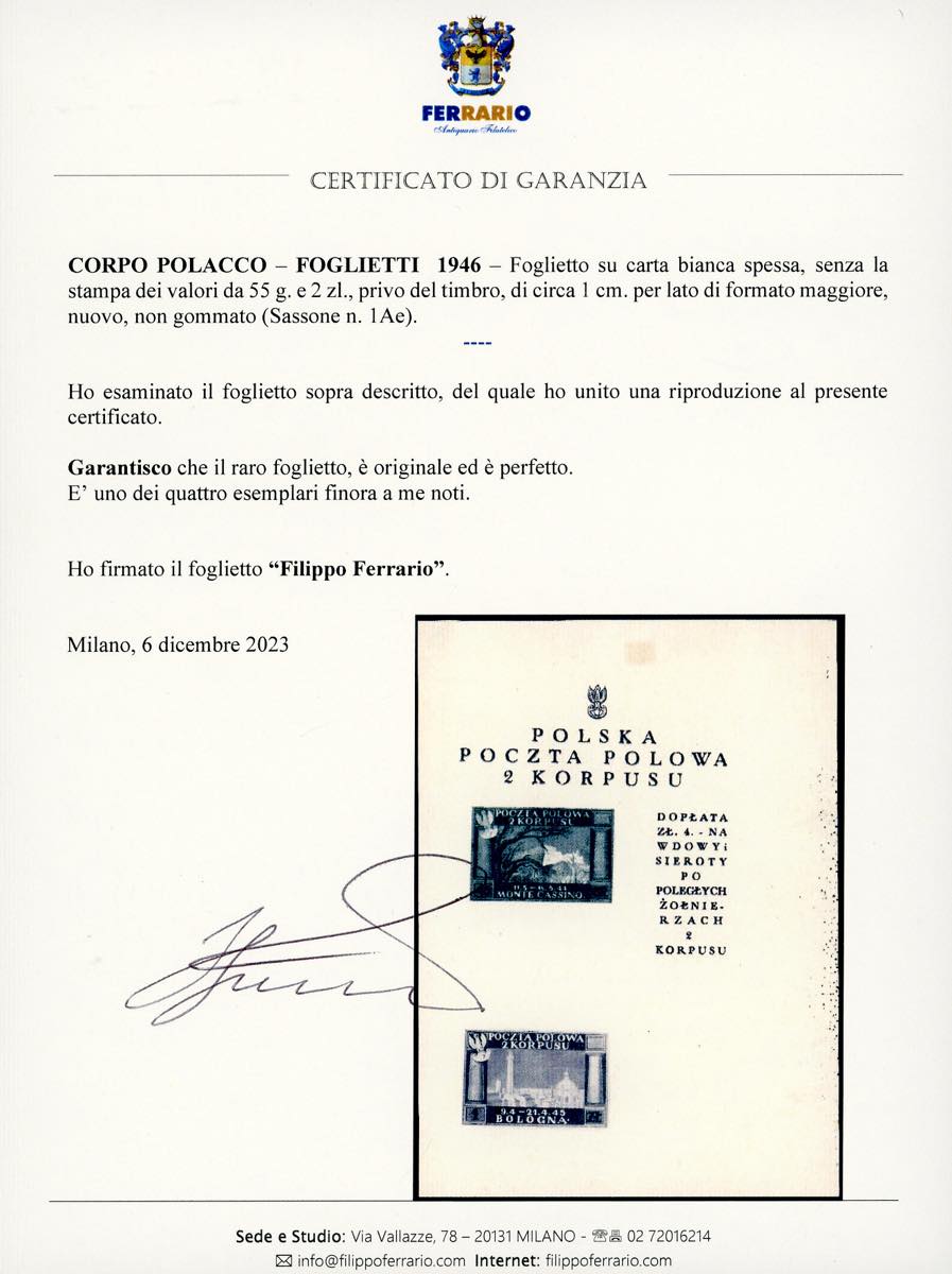 FOGLIETTI 1946 - Foglietto su carta bianca spessa, non gommato, senza la stampa dei valori da 55 g. e 2 zl., privo del timbro (1Ae), ... Read more