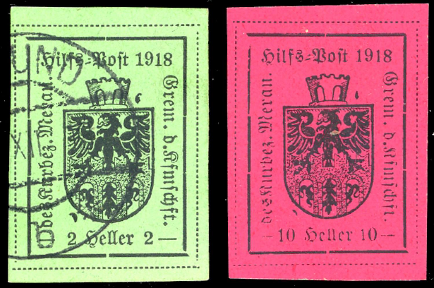 Lot 2085 - MERANO 1918 - 2 h. verde chiaro, usato e 10 h. carminio ...