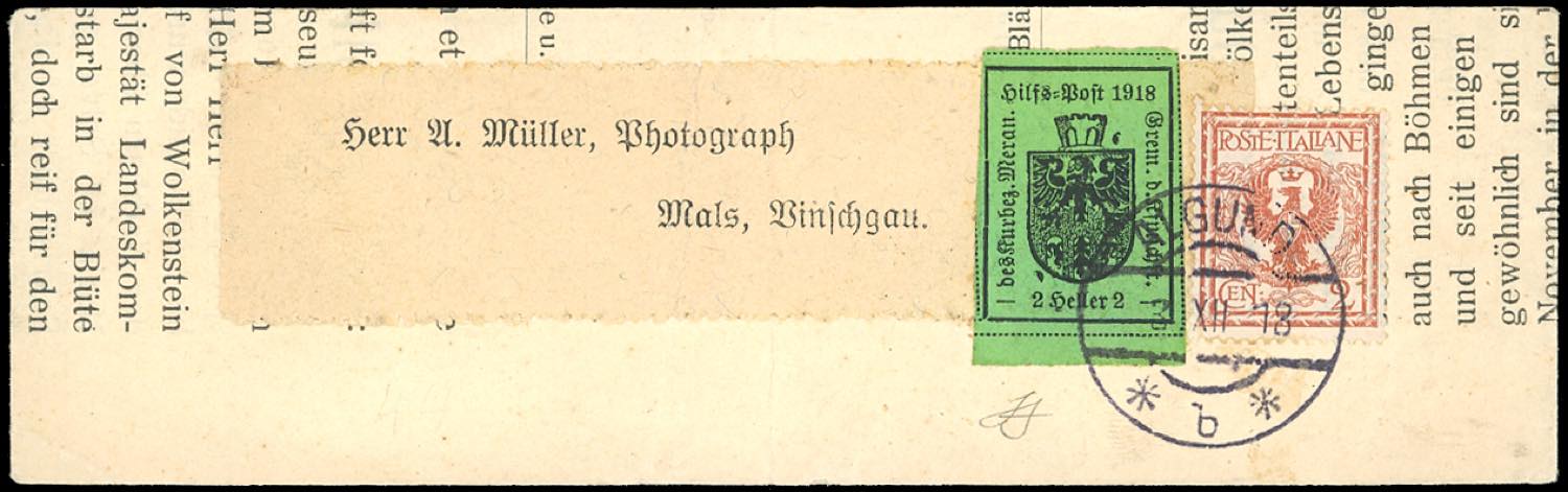 MERANO 1918 - 2 h. verde, II tipo (6), in affrancatura mista con 2 cent. Floreale (69), perfetti, su fascetta completa da Algund 3/12/1918 ... Read more