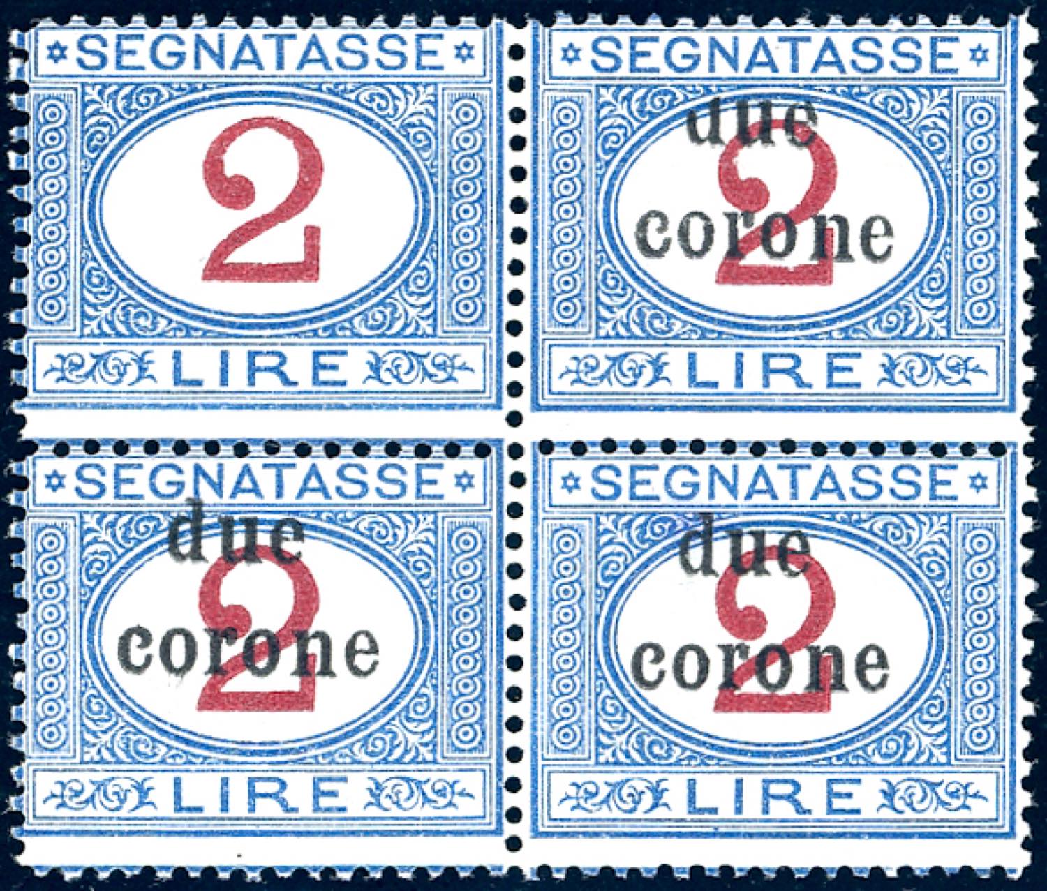 TRENTO E TRIESTE SEGNATASSE 1919 - 2 corone su 2 lire, blocco di quattro, un esemplare senza soprastampa (8ca), nuovo, senza gomma come ... Read more