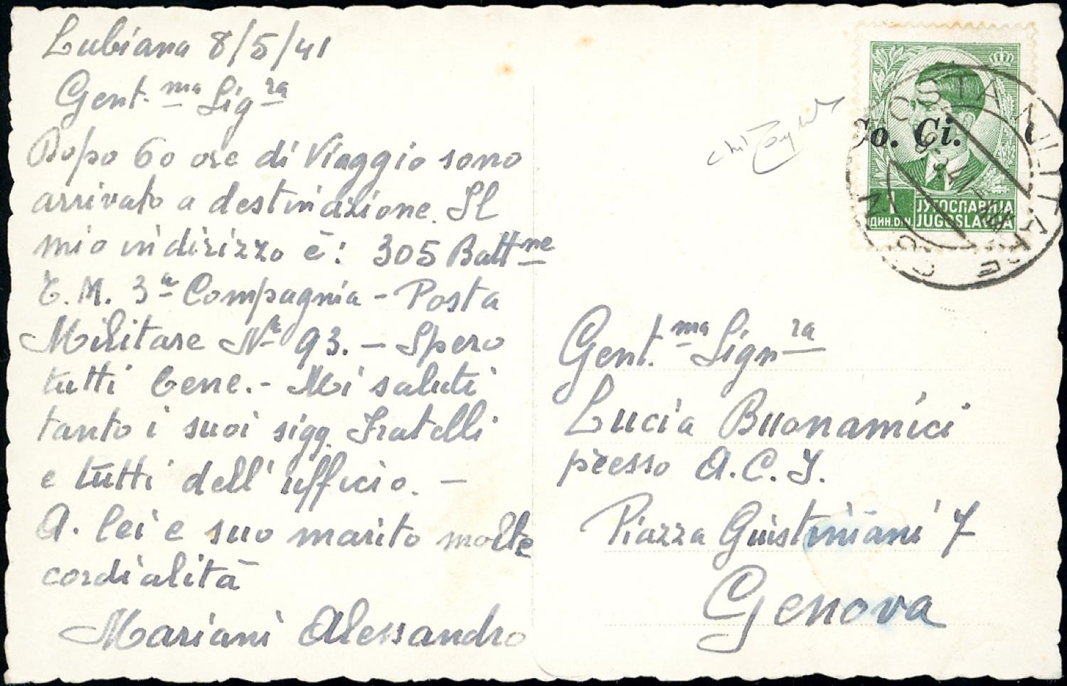 LUBIANA 1941 - 1 d. soprastampa "Co.Ci." a macchina fortemente spostata a sinistra, "C" a cavallo (3fb), perfetto, su cartolina dalla Posta Militare 8/5/1941 a Genova. Raybaudi.
