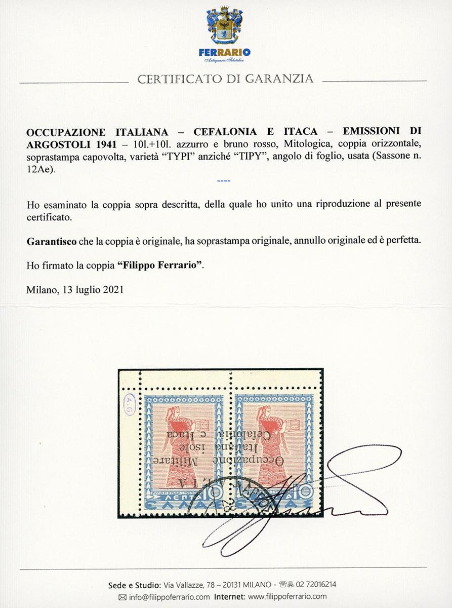 EMISSIONI DI ARGOSTOLI 1941 - 10 l. + 10 l. mitologica, varietà "TYPI" anziché "TIPY", soprastampa capovolta (12Ae), angolo di foglio, usato, perfetto. Si tratta dell'UNICO ESEMPLARE NOTO, citato dal catalogo Sassone. Rarità del settore. Avanzo, cert. Ferrario.