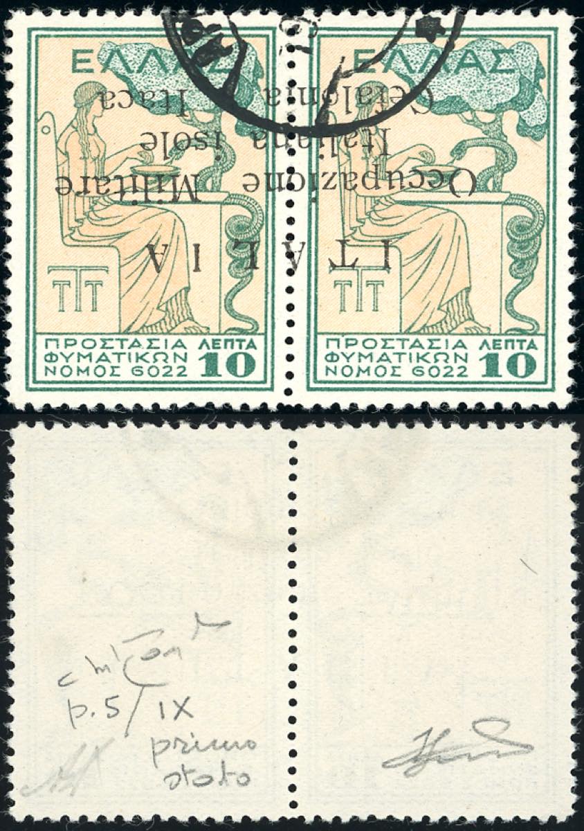 EMISSIONI DI ARGOSTOLI 1941 - 10 l. + 10 l. Beneficenza, soprastampa capovolta (32e), usato, perfetto. Raybaudi, A.Diena, cert. Ferrario.