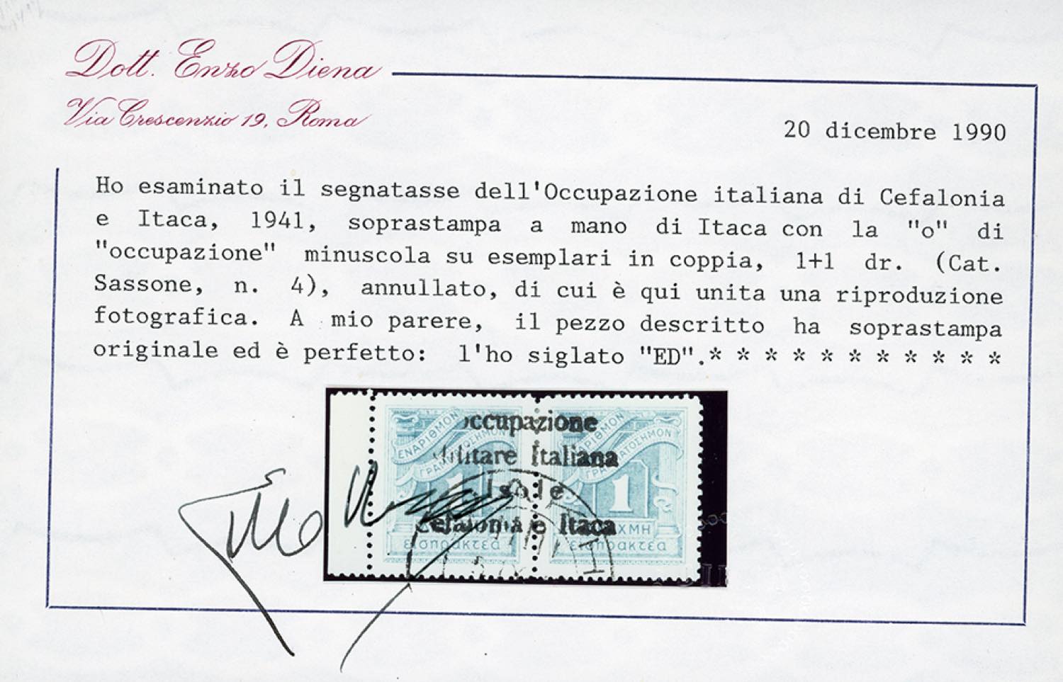 EMISSIONI DI ITACA SEGNATASSE 1941 - 1 d. + 1 d. (4), bordo di foglio, usato, perfetto. Bellissimo e molto raro. A.Diena, Colla, cert. ... Read more