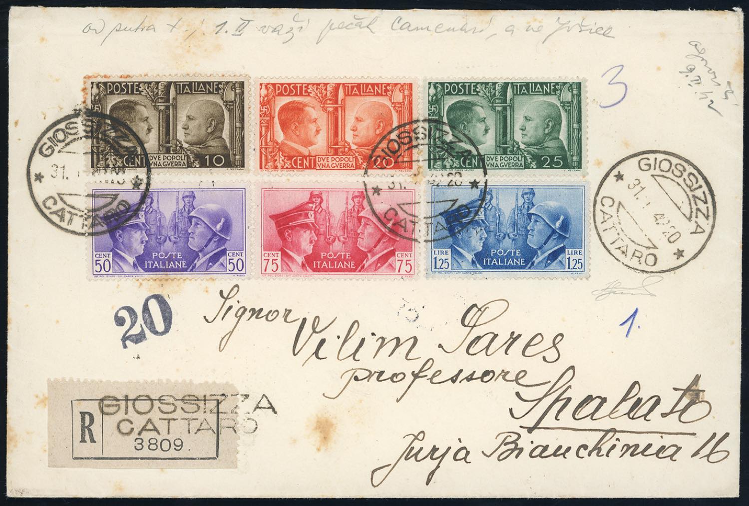 CATTARO 1942 - Fratellanza d'armi, serie completa (452/457), lievi ossidazioni, su busta raccomandata da Giossizza 31/2/1942 a Spalato. Annullo raro, specialmente su raccomandata. Ferrario.