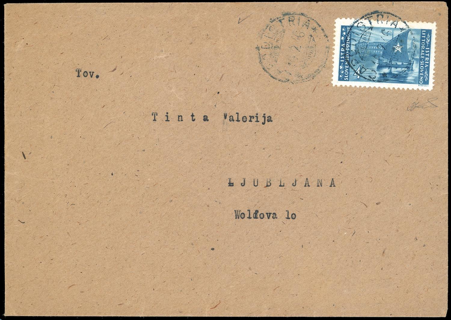 ISTRIA E LITORALE SLOVENO 1946 - 4 lire, tiratura di Lubiana (46), perfetto, su busta da Capodistria 16/2/1946 a Lubiana. Ferrario.
