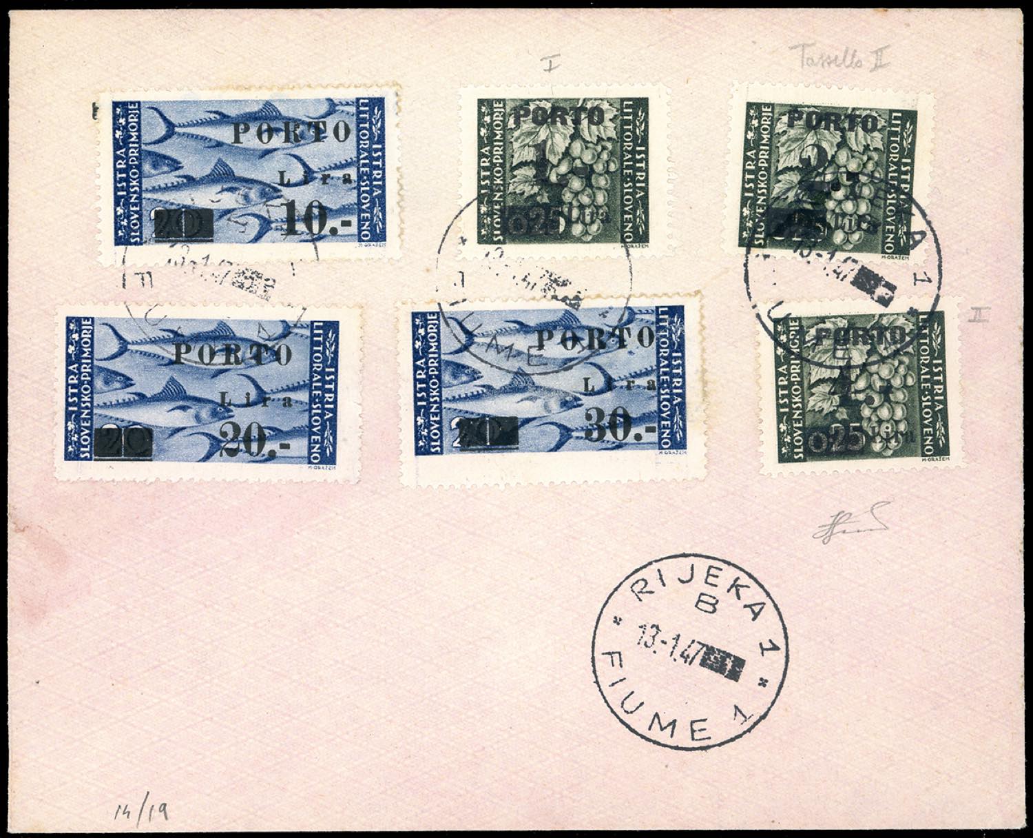 ISTRIA E LITORALE SLOVENO SEGNATASSE 1947 - Soprastampati, serie completa (14,15/II,16/ii,17,18,19), perfetti, usati su busta senza indirizzo a Fiume 13/1/1947. Ferrario.