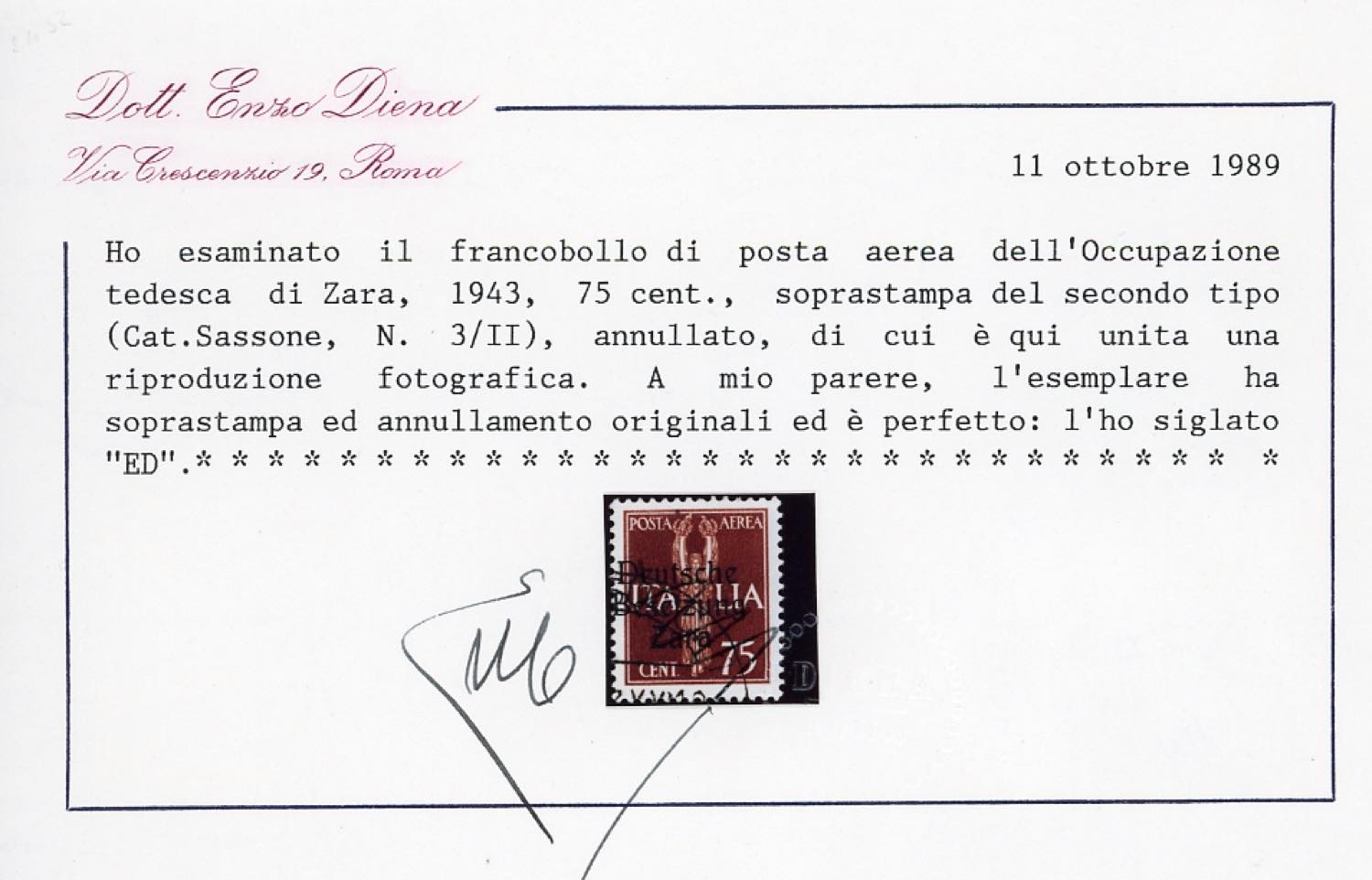 OCCUPAZIONE TEDESCA ZARA POSTA AEREA 1943 - 75 cent., soprastampa del II tipo (3/II), perfetto, usato. Cert. E.Diena.