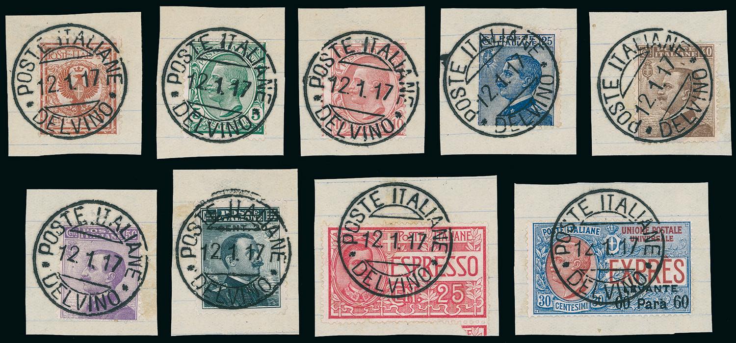 ALBANIA-DELVINO 1917 - Floreale, Leoni, Michetti, espressi di Regno e Levante (69,81/82,83/85,106,E1,E2), nove esemplari, perfetti, usati ... Read more