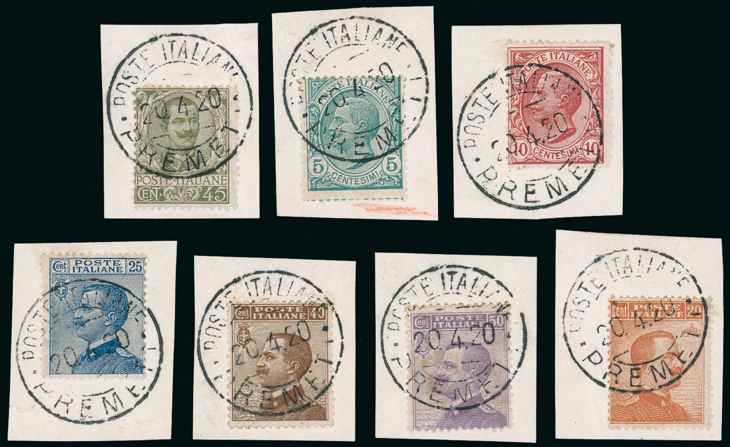 ALBANIA-PREMETI 1920 - Floreale, Leoni, Michetti (75,81/82,83/85,109), sette esemplari, perfetti, usati a Premeti 20/4/1920. Ferrario.
