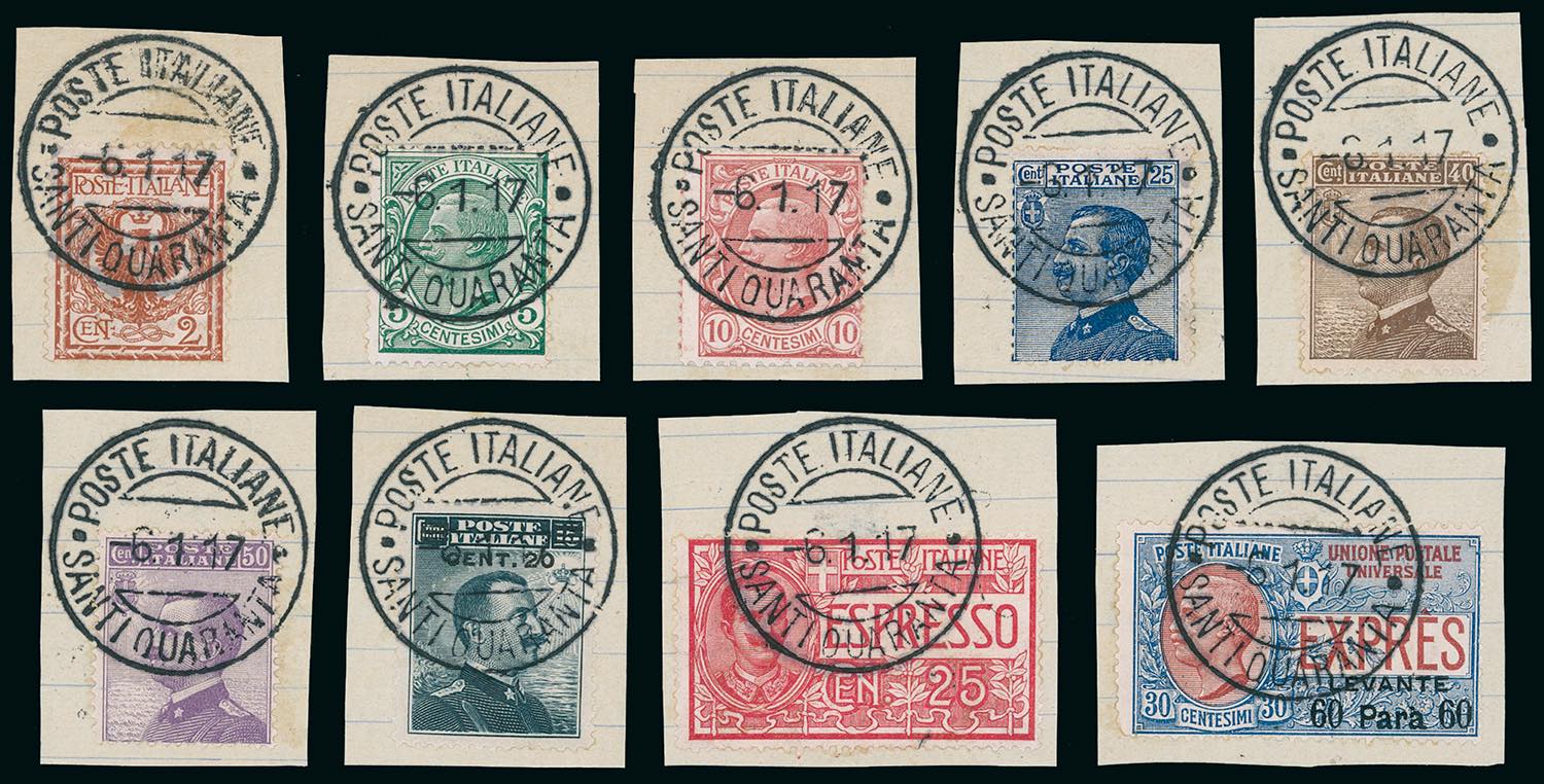 ALBANIA-SANTI QUARANTA 1917 - Floreale, Leoni, Michetti, espressi di Regno e Levante (69,81/82,83/85,106,E1,E2), nove esemplari, perfetti, ... Read more