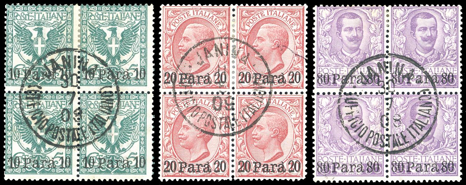 ALBANIA 1907 - Soprastampati con nuovo valore senza "Albania" (10/12), blocchi di quattro, usati, perfetti.