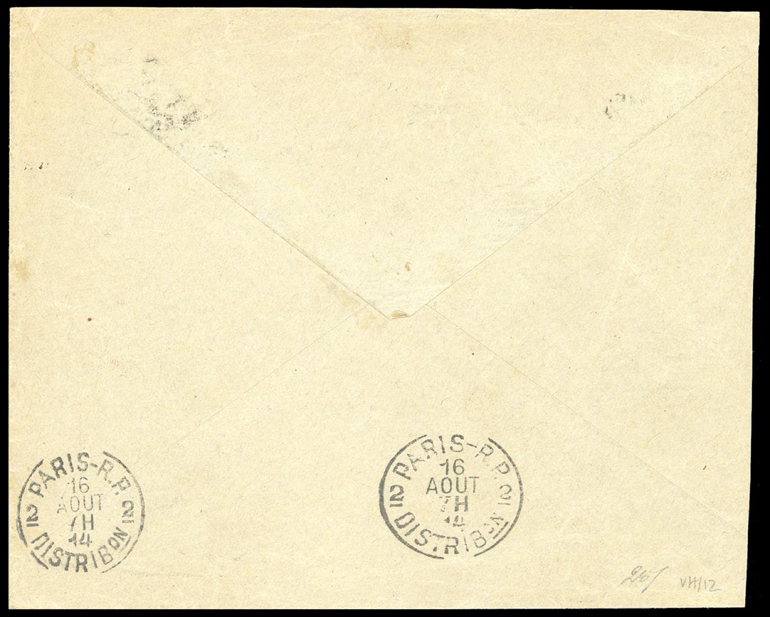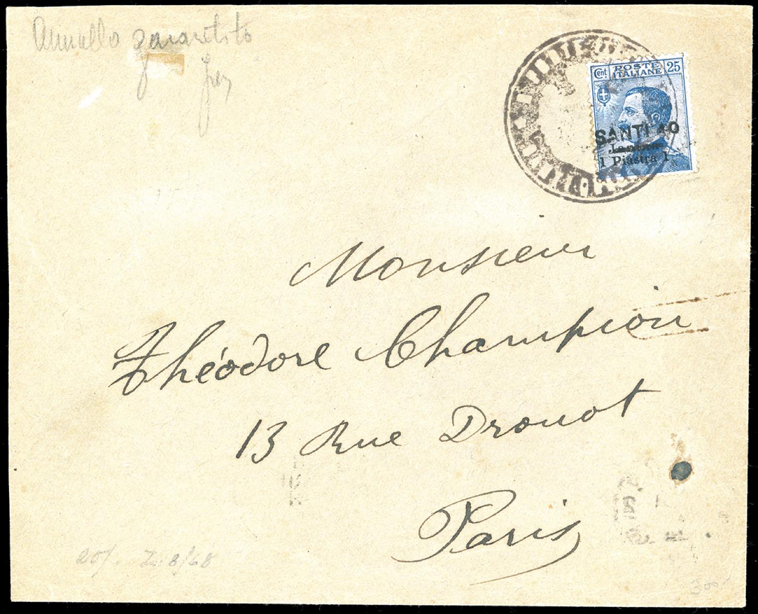 ALBANIA UFFICIO POSTALE ITALIANO 1914 - 1 pi. su 25 cent. (Giannina 4), con soprastampa semiufficiale "SANTI 40", perfetto, con lo speciale annullo in negativo su busta da Parigi, bollo di arrivo al verso del 16/8/1914, indirizzata a Thedor Champion. Molto rara.