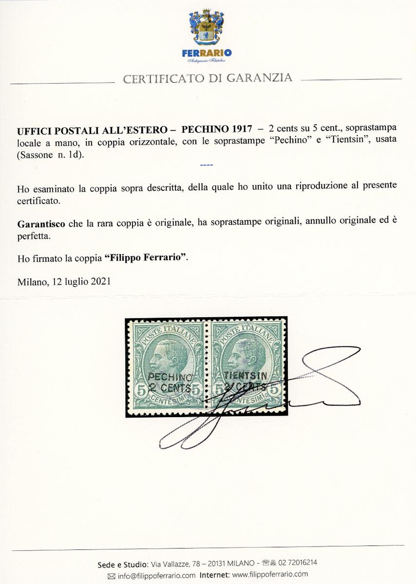 PECHINO 1917 - 2 cents su 5 cent., coppia orizzontale con le soprastampe "Pechino" e "Tientsin" in coppia (1d), usata, perfetta. Rara, cert. Ferrario e Sorani.