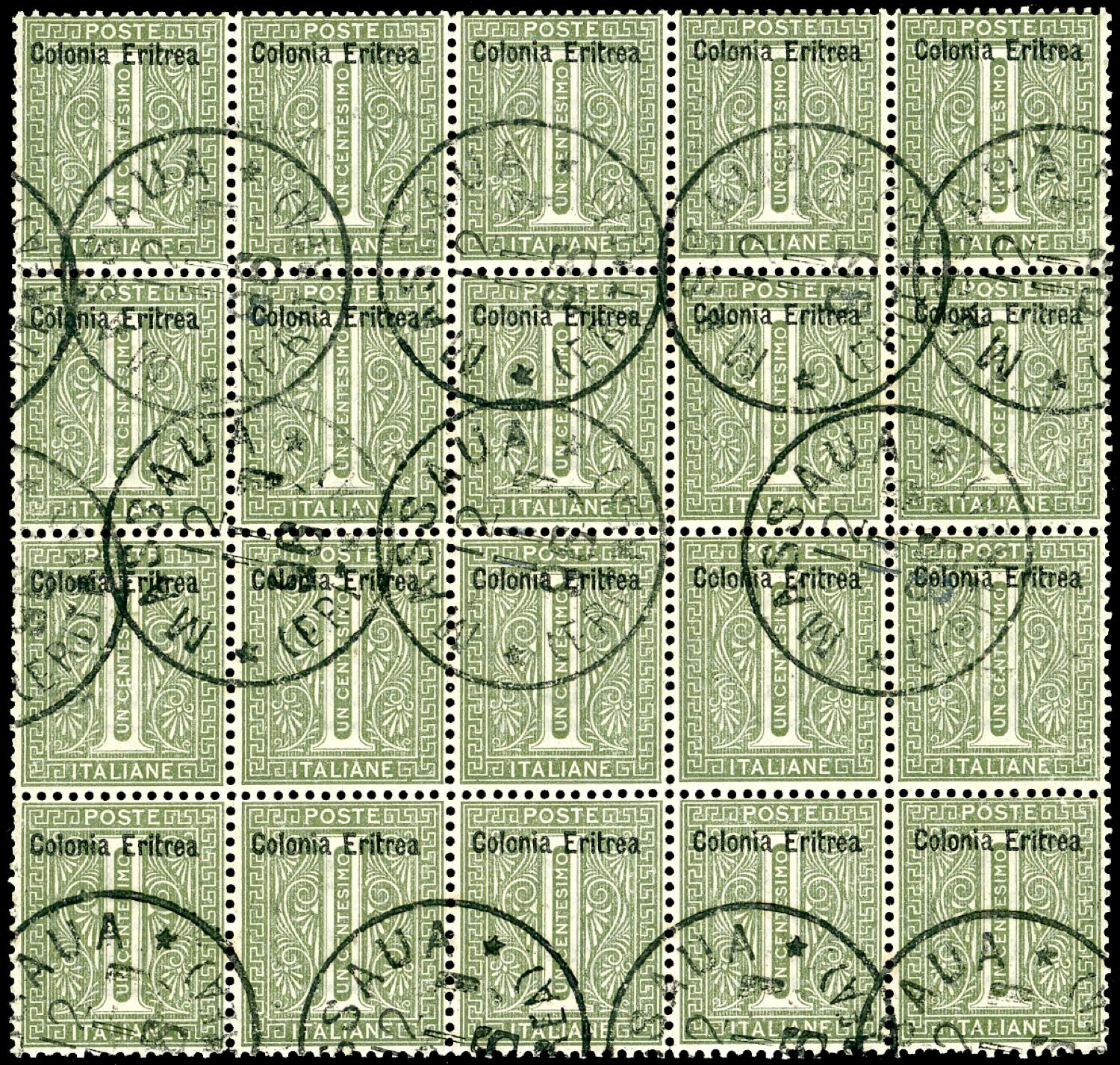 1893 - 1 cent. De La Rue soprastampato (1), eccezionale blocco di 20 usato a Massaua, perfetto. Probabilmente il massimo blocco noto usato. ... Read more