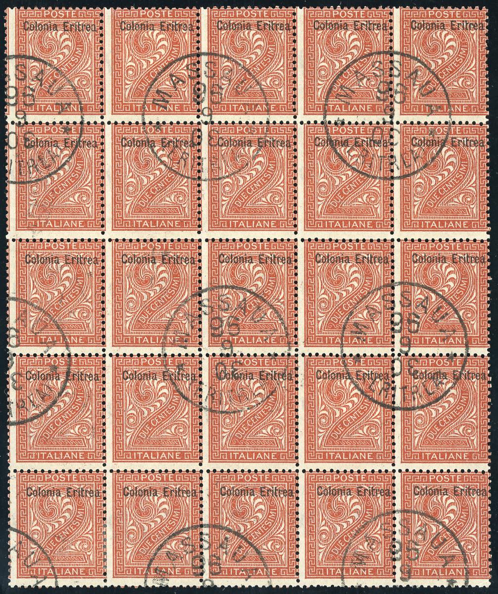 1893 - 2 cent. De La Rue soprastampato (2), blocco di venticinque esemplari usati a Massaua, perfetto. Raro, probabilmente il massimo blocco noto usato! Cert. Raybuadi.
