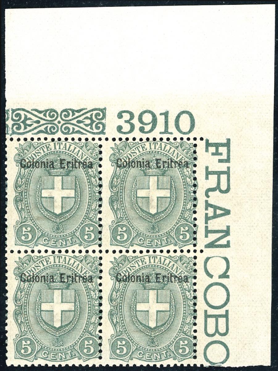 1897 - 5 cent. Umberto I (14), blocco di quattro, angolo di foglio con numero di tavola, perfetto, gomma originale integra. Bello!