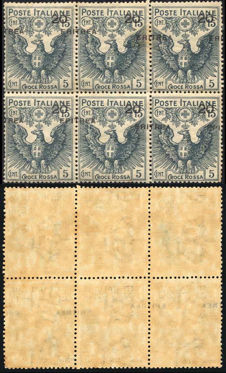 1916 - 20 su 15 + 5 cent. Croce Rossa (43), blocco di sei con soprastampa fortemente spostata in senso verticale, "a cavallo", soprastampe disallineate e varietà "EPITREA", gomma integra, perfetto. Insieme unico e non catalogato!