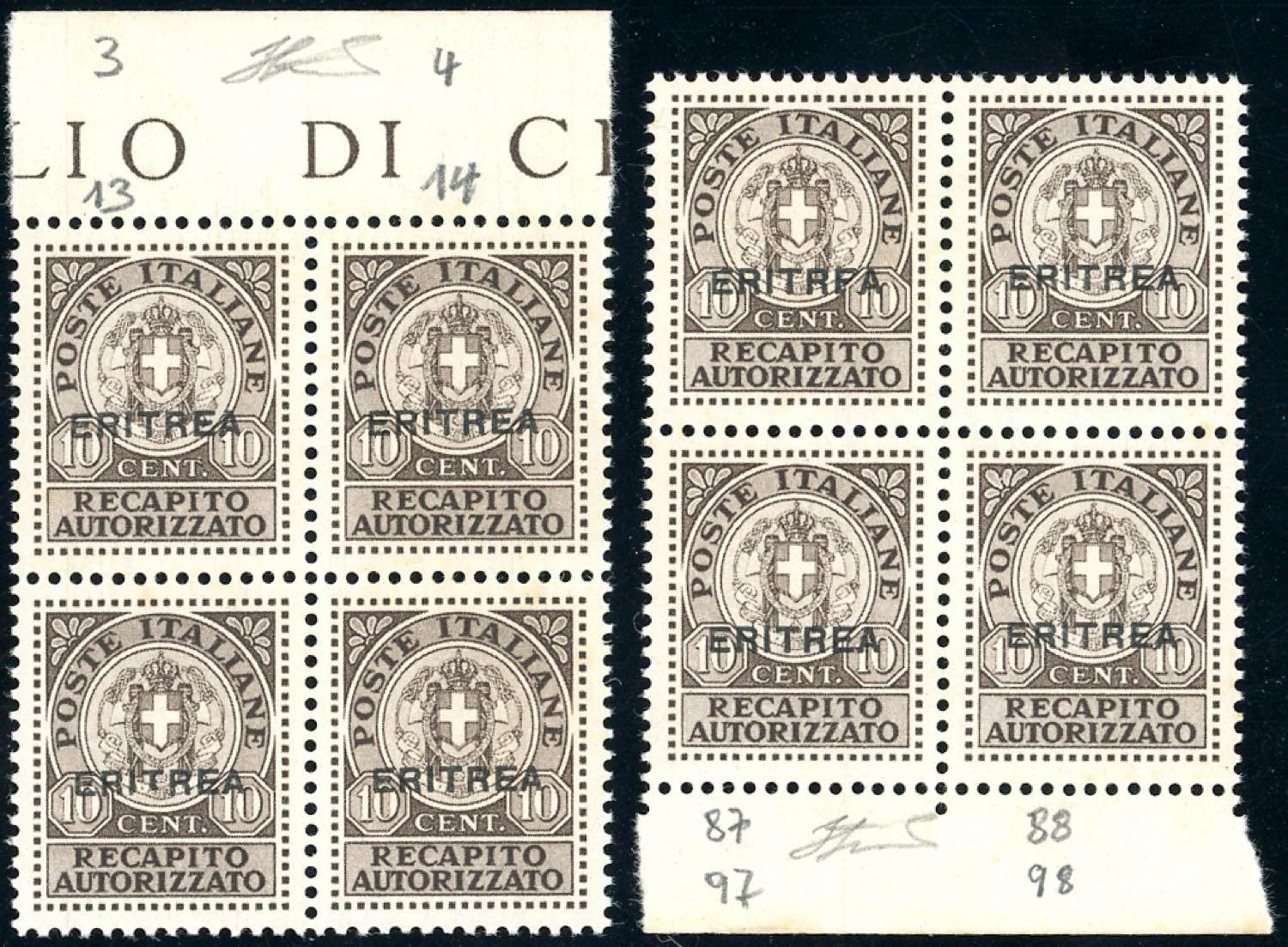 RECAPITO AUTORIZZATO 1939 - 10 cent., due blocchi di quattro, uno con un esemplare con la seconda "E" incompleta, l'altro con un esemplare ... Read more