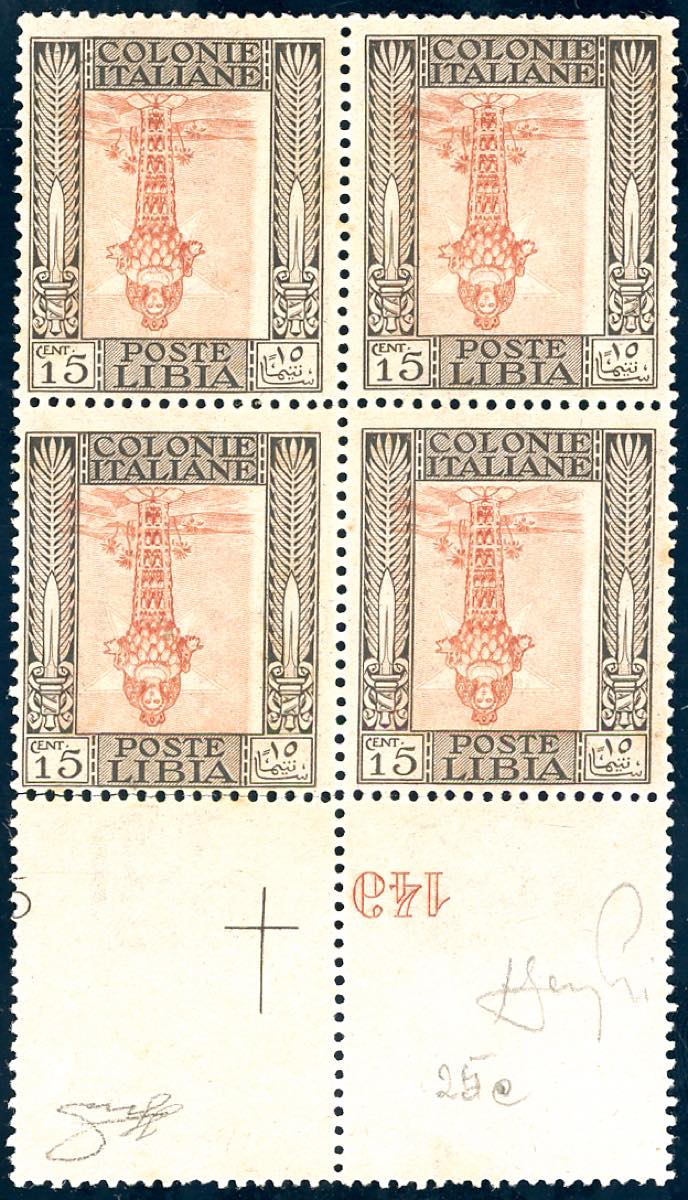 1921 - 15 cent. bruno e arancio Pittorica, filigrana corona coricata, centro capovolto (25c), blocco di quattro bordo di foglio inferiore ... Read more