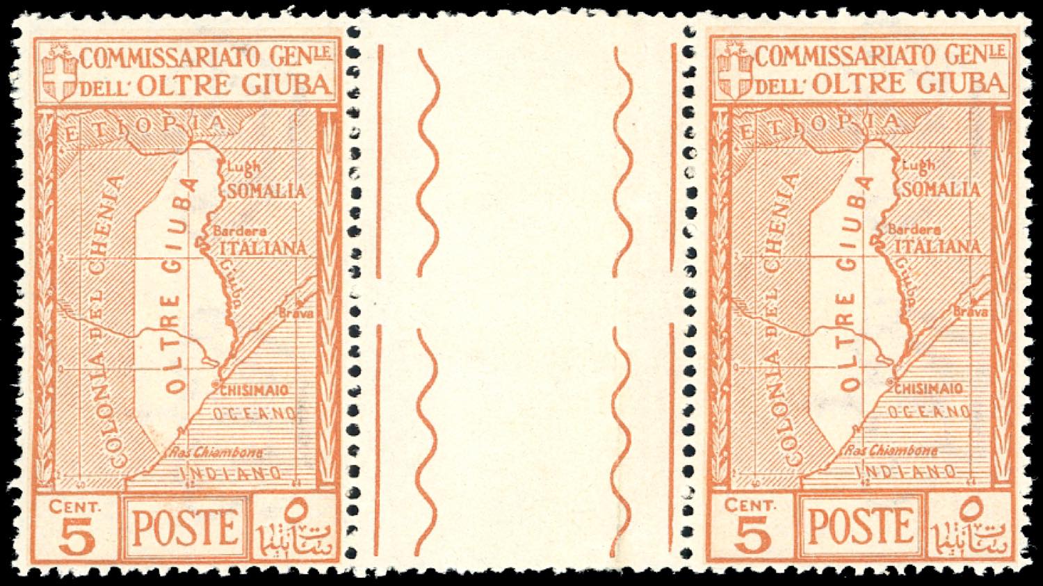 1926 - 5 cent. arancio Annessione (29), coppia orizzontale con interspazio di gruppo al centro, nuova, gomma originale integra, perfetta. ... Read more