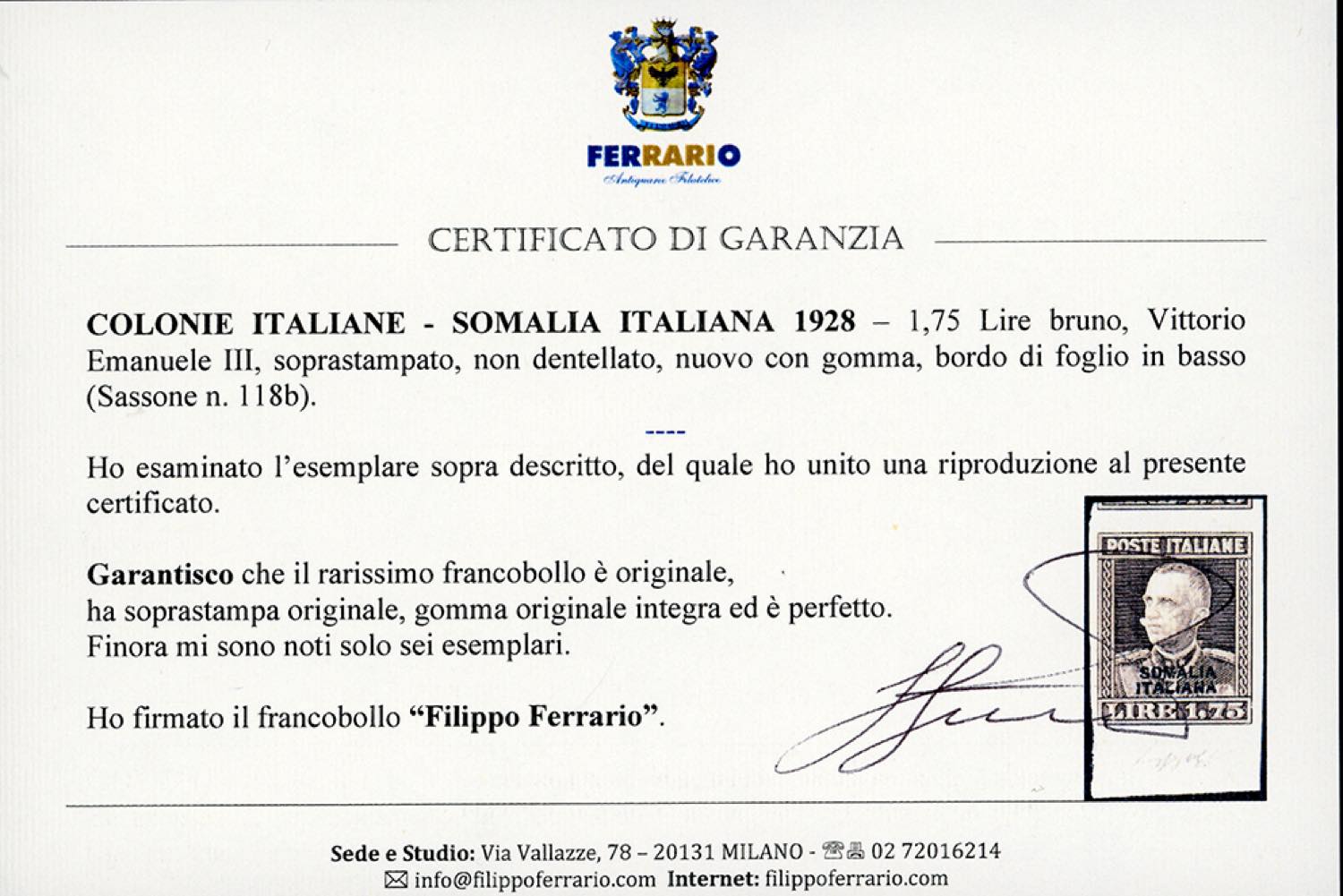 1928 - 1,75 lire bruno, Vittorio Emanuele III, soprastampato, non dentellato (118b), nuovo, bordo di foglio inferiore, gomma originale integra, perfetto. Splendido ed estremamente raro, solo 6 esemplari noti. A.Bolaffi, cert. Ferrario.
