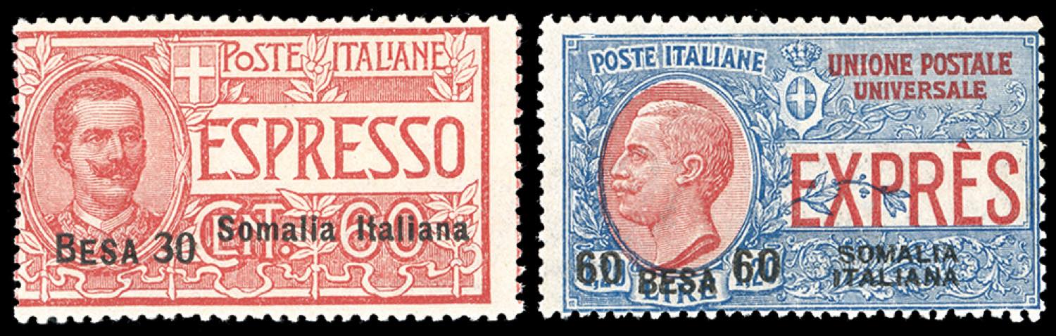 ESPRESSI 1923 - Soprastampati in moneta somala, serie completa (1/2), gomma originale integra, perfetti e molto freschi. Ferrario.