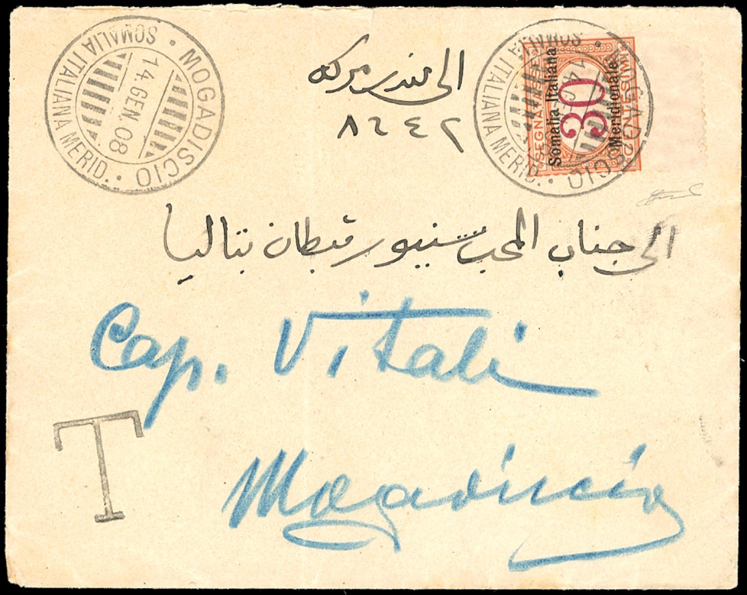 SEGNATASSE 1908 - 30 cent. soprastampato Somalia Italiana Meridionale (4), bordo di foglio, perfetto, su busta non affrancata per Mogadiscio 14/1/1908. Bella e non comune. Ferrario.