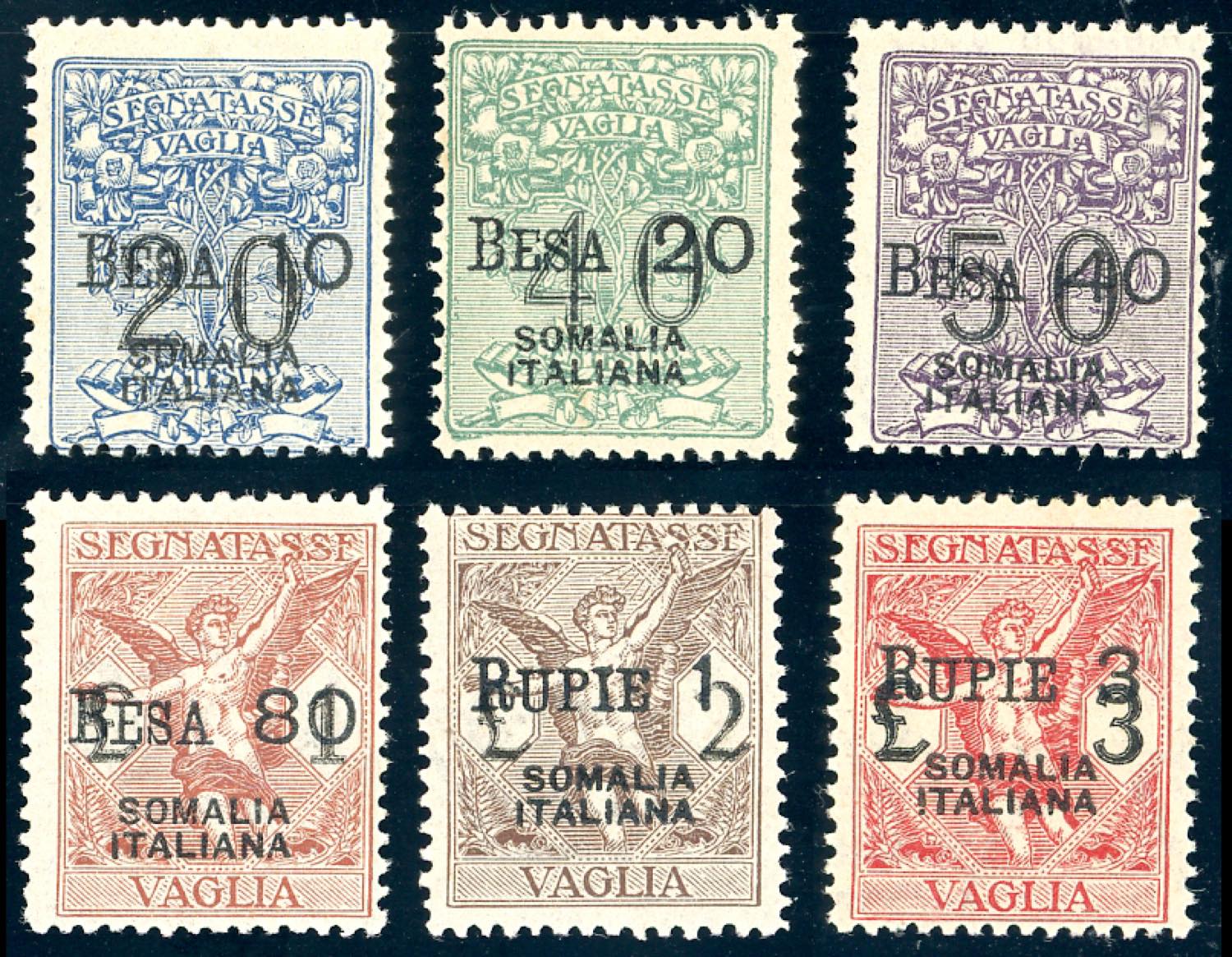 SEGNATASSE VAGLIA 1924 - Soprastampati in moneta somala, serie completa (1/6), gomma originale integra, perfetti. Ferrario.