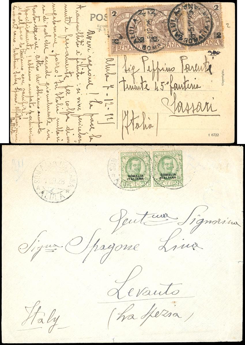 ANNULLAMENTI-ALULA - 2 b. su 2 c. su 1 b. (35), striscia di tre, difetti, su cartolina del 5/12/1925 per Sassari e 25 cent. Floreale (96), coppia, perfetta, su busta del 11/9/1928 per Levanto.
