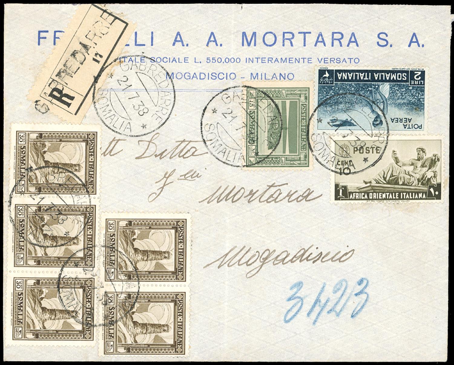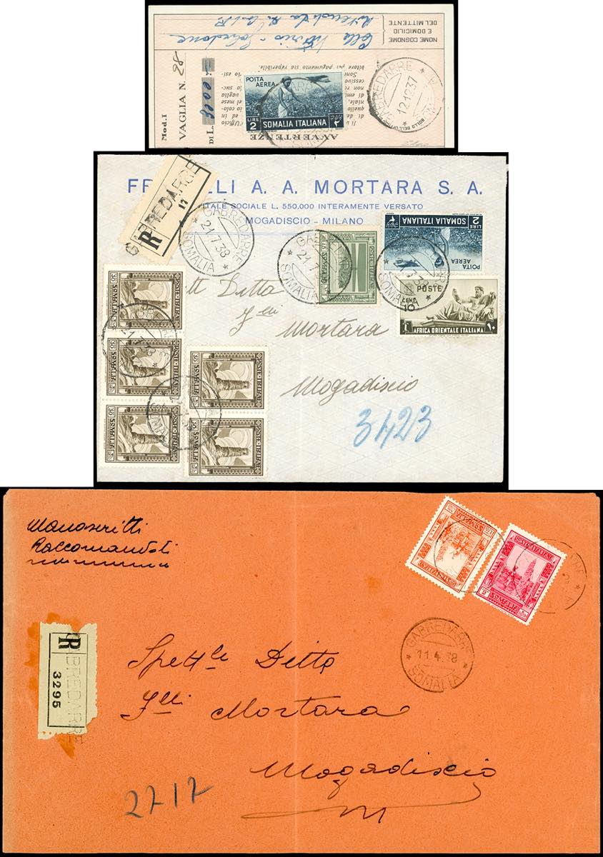 ANNULLAMENTI-GABREDARRE - 1,75 lire e 2 lire Pittorica (223/224), perfetti, su busta contenente "manoscritti raccomandati" del 11/4/1938 per Mogadiscio; 2 lire posta aerea Soggetti africani (A23), perfetto, su ricevuta vaglia del 12/12/1937; busta raccomandata pluriaffrancata del 21/7/1938 per Mogadiscio. Interessante e pregevole insieme.