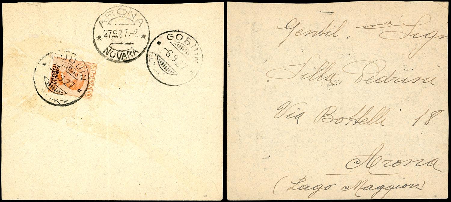 ANNULLAMENTI-GOBUIN - 60 cent. Michetti (97), perfetto, al verso di busta, rifilata a destra, del 6/9/1927 per Arona. Annullo di pregio.