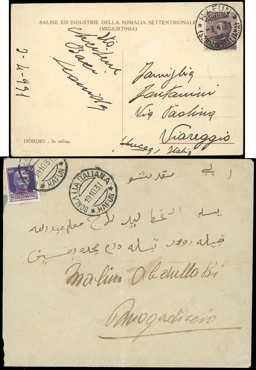 ANNULLAMENTI-HAFUN - 20 cent. Michetti (95), perfetto, su cartolina del 3/4/1931 per Viareggio; 50 cent. Imperiale (166), perfetto, su busta del 19/10/1931 per Mogadiscio.