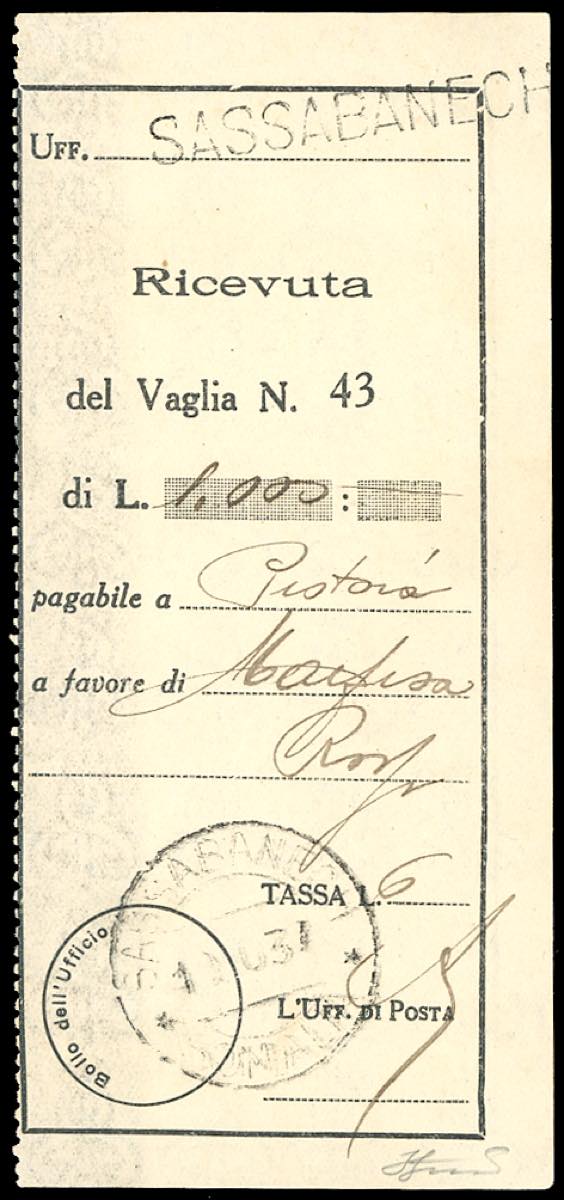 Lot 2666 - ANNULLAMENTI-SASSABANECH - Ricevuta vaglia con bollo del ...
