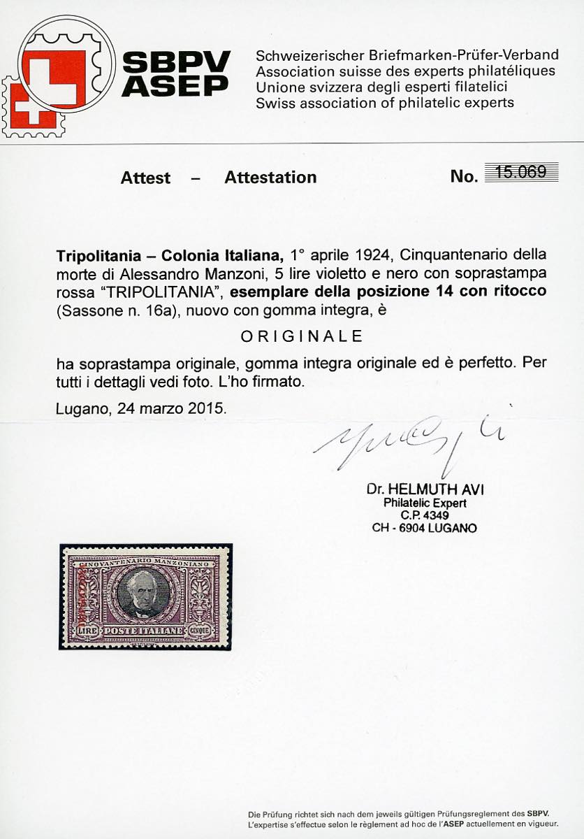 1924 - 5 lire Manzoni, pos. 14 con ritocco (16a), gomma integra, perfetto. Molto raro, tiratura solo 75 esemplari. Cert. Avi.